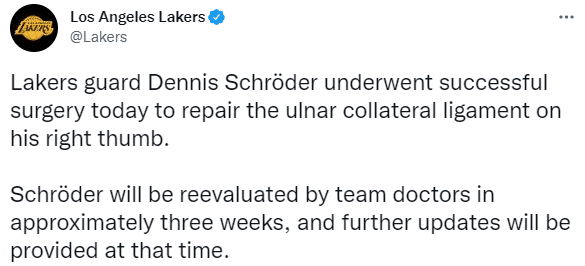 湖人伤病满营,施罗德归队后仅仅只打了一场季前赛就伤了,湖人官方宣布,施罗德成功接受右手拇指尺侧副韧带撕裂修复手术,三周内接受复查,球队未来将进一步及时更新他的伤情。