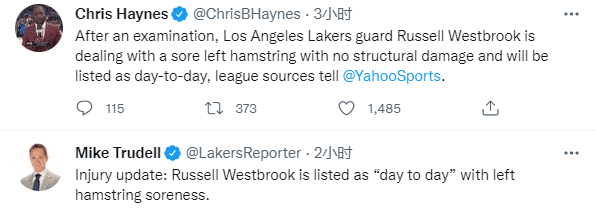 360直播10月17日,湖人巨头威少的腿筋检查结果出炉,据名记Chris Haynes报道,威少的左腿筋无结构性损伤,仅仅只是左腿筋酸痛,进入每日观察名单;另外据报道,新赛季常规赛威少会继续替补。