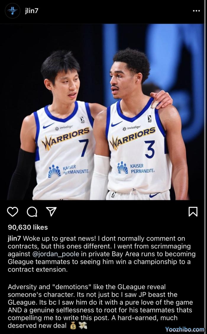 对于普尔续约,普尔前队友林书豪祝贺普尔,晒昔日赛场照并且配文写道:一觉醒来看到了普尔续约的好消息。我通常不会对合同发表评论,但这次不一样。从我俩在湾区时候的私人球局,到征战G联赛时成为队友,再到他赢得总冠军,现在他与勇士续签了一份大合同。