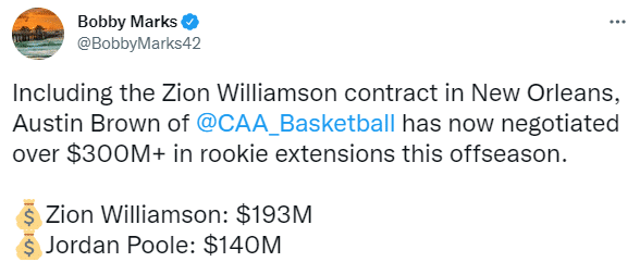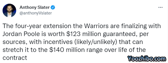 在签约截止日之前,勇士和普尔提前续签4年1.4亿美元的大合同,平均年薪是3500万美元;勇士随队记者AnthonySlanter跟进报道,勇士与乔丹-普尔签订的提前续约合同中保障部分为1.23亿美元,包含1700万美元的激励条款。