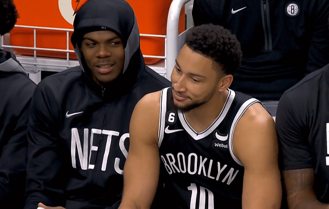 第二节,西蒙斯3投1中拿到2分,但上场5分钟又吃到2次犯规,11分钟累计吃到5犯,第二节7分55秒,西蒙斯被迫下场休息,下场时无奈地苦笑;杜兰特和欧文在进攻端发力,半场打完篮网65-49领先16分,杜欧两大巨头半场合砍34分。