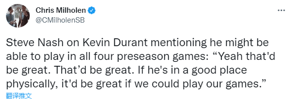 此前杜兰特接受媒体采访时表示自己会打满4场季前赛,纳什确定杜兰特会打满4场季前赛,表示:是的,那真的太棒了,如果他的身体状态感觉良好,我们就能打出属于我们自己的比赛了。