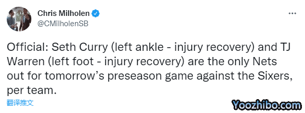 360直播10月03日讯,篮网季前赛对阵费城76人的伤情报告出炉,篮网队两人因伤缺席比赛,赛斯-库里(左脚踝,伤病康复)和TJ-沃伦(左脚,伤病康复)因伤休战,篮网其他球员都可以出战;杜兰特、欧文和西蒙斯三巨头带队出战,西蒙斯迎来篮网生涯首秀。