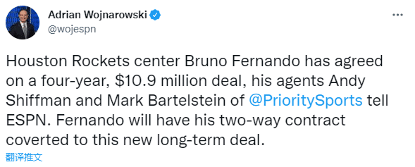 据名记沃纳罗斯基报道,球员经纪人透露,中锋布鲁诺-费尔南多已与火箭队签下一份4年1090万美元的合同;2天前,火箭刚刚将布鲁诺-费尔南多的Exhibit 10合同转化为双向合同,现在他的双向合同又变成一份价值千万美元的长期合同。