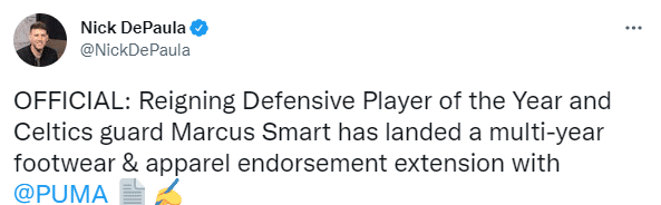 据球鞋名记Nick DePaula报道,凯尔特人球员斯玛特与彪马续签一份多年的鞋类与服装代言合同;2019年,斯玛特和彪马签下3年代言合同,如今续约继续代言该品牌;彪马的代言人还有库兹马、艾顿、施罗德、拉梅洛-鲍尔等NBA球员。