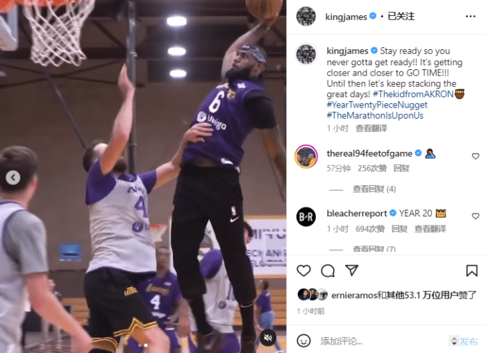 360直播10月02日讯,湖人队继续进行训练,37岁詹姆斯晒霸气暴扣的训练赛视频,正式发声迎接生涯第20个赛季,新赛季冲击多项常规赛历史纪录。