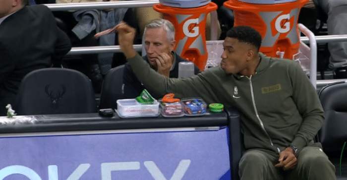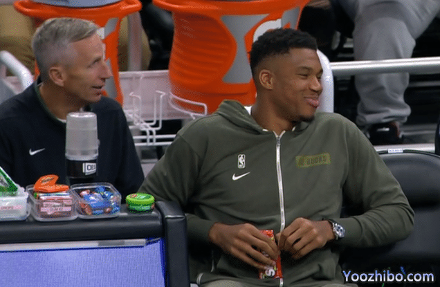 字母哥不仅坐在替补席后面吃爆米花,吃着吃着,字母哥换了一个位置,坐在技术台附近,开始吃起了彩虹糖,狂吃零食太得劲,由于手里拿着零食,字母哥甚至没法和队友击掌庆祝。