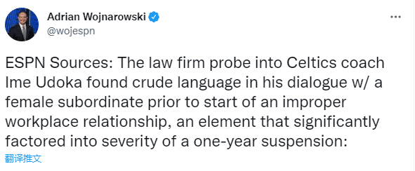 据名记沃纳罗斯基报道,经律师事务所调查发现,乌度卡在与一名女性下属的对话中使用了粗鲁的言语,然后与该女性开始了不正当的工作关系,这是他被停职一年的重要原因。