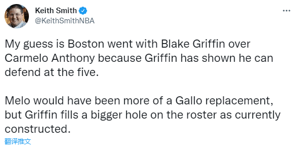 对于绿军引援格里芬,名记Keith Smith表示:我想波士顿选择格里芬而不是安东尼是因为格里芬已经证明他可以在五号位防守。而甜瓜更像是加洛(加里纳利)的替代者,但格里芬填补了目前阵容中一个更大的空缺。