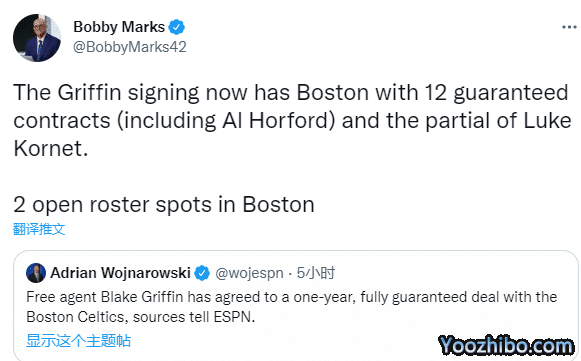 据薪资专家Bobby Marks报道,到目前为止,凯尔特人阵中拥有12份全额保障合同以及1份部分保障合同(卢克-科内特),他们常规赛15人大名单仍拥有2个空缺位置。