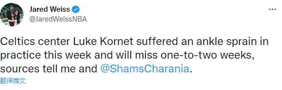 根据绿军队记者Jared Weiss报道,凯尔特人中锋科内特在训练时扭伤脚踝,将因伤缺席1-2周;21-22赛季,27岁的科内特为凯尔特人出战12场,场均得到2.2分2.1篮板。