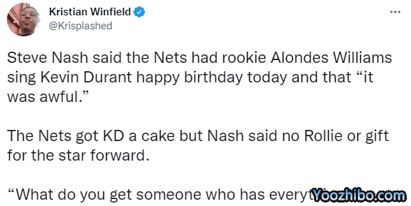 谈到杜兰特的34岁生日时,纳什表示:我们让新秀阿朗德斯-威廉姆斯给杜兰特唱了生日快乐歌,他的歌声太糟糕了。