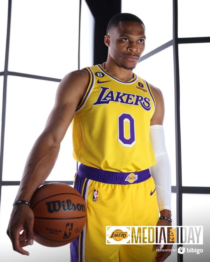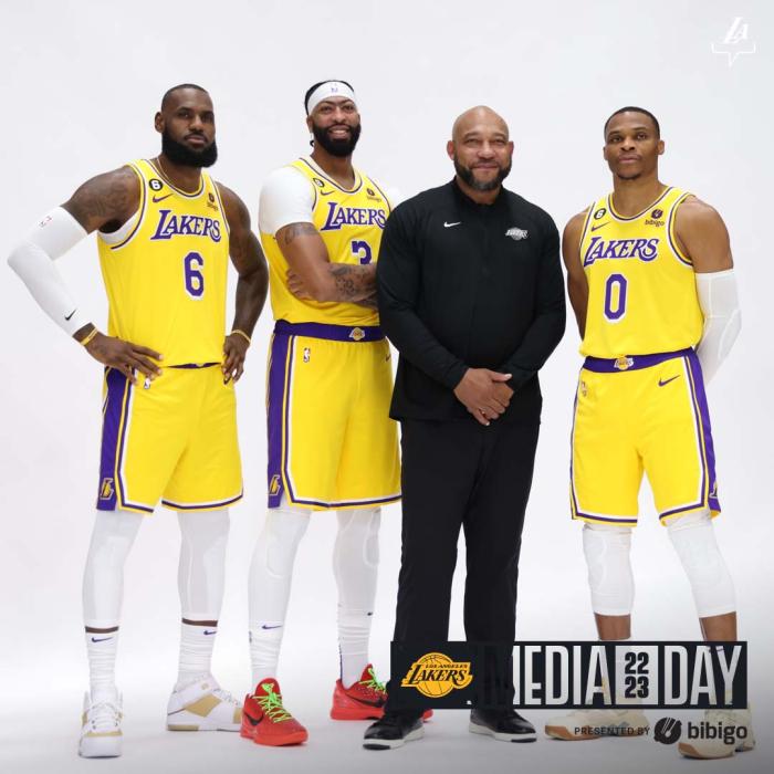 众球员都身穿印有向拉塞尔致敬的6号补丁,詹姆斯、浓眉、威少和新帅哈姆合影;单独拍照时,詹姆斯、浓眉和威少都是表情严肃,其中浓眉戴着发带;新援贝弗利身穿21号、朗尼-沃克身穿4号、安德森身穿95号和特洛伊-布朗身穿7号(安东尼上赛季所穿的球衣号码)亮相。