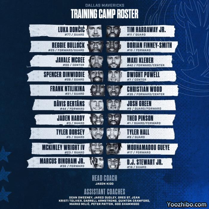 东契奇、小哈达威、布洛克、芬尼-史密斯、麦基(00号)、克莱贝尔、丁威迪、鲍威尔、尼利基纳(21号)、伍德(35号)、贝尔坦斯、约什-格林(8号)、杰登-哈迪(3号)、平森、泰勒-霍尔(9号)、泰勒-多西(5号)、麦金利-赖特(23号)、穆罕默德-古耶(17号)、小马库斯-宾汉姆(30号)和DJ-斯图尔特(16号)。