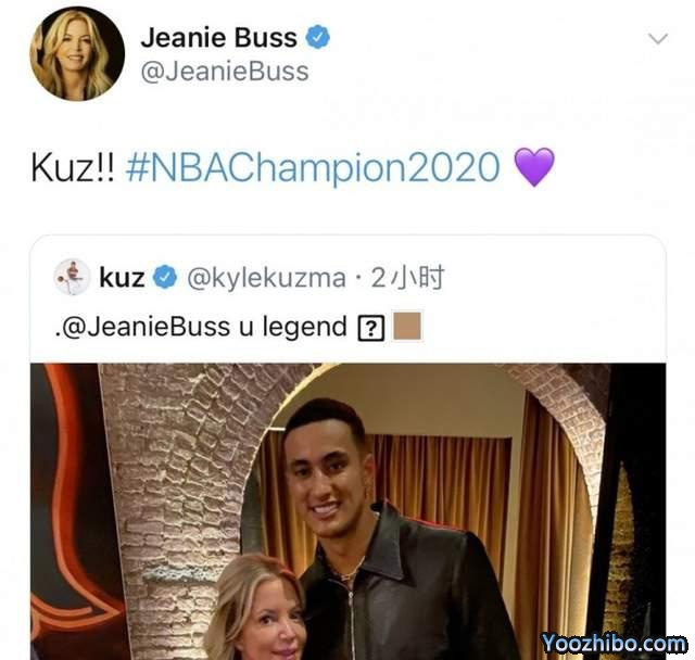 360直播09月18日众所周知湖人是目前NBA市值排名前几的球队,但湖人的现任老板珍妮-巴斯却是NBA这么多老板中资产倒数前几的人,那是因为巴斯家族只对湖人拥有运营权,而真正股份却很少。不过这并不影响珍妮阿姨在球迷们心中的地位,近日珍妮阿姨也是更新了自己的社交媒体动态,她转发了前湖人球员库兹马的一条动态,而动态的内容就是他们两人相拥在一起的合照。珍妮还配文:库兹马!2020年总冠军。
