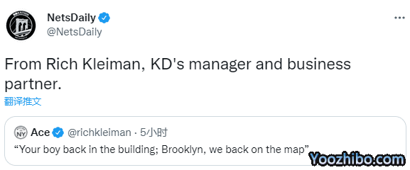 360直播09月18日,杜兰特经纪人兼商业合伙人里奇-克莱曼发推写道:你们的伙计回到了球馆,布鲁克林,我们回来了。