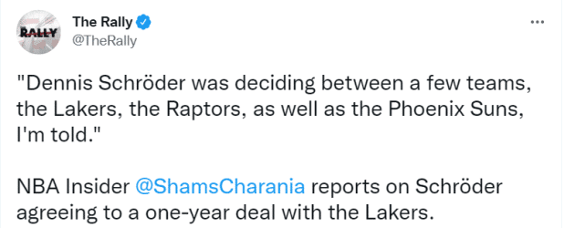 360直播09月17日,名记Shams报道称,施罗德计划和湖人签下1年264万美元的合同,再次为这支球队效力,为此他拒绝了猛龙、太阳等队的邀请。施罗德本人也第一时间更新社媒,重回湖人后首次发声。名嘴Bill Simmons依然看衰湖人前景,认为得到施罗德湖人也只是西部9号种子。