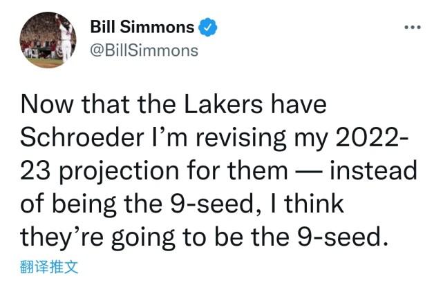 施罗德加盟湖人,提升了阵容后场深度,但名嘴Bill Simmons依然看衰湖人的前景。他在社媒上写道:“湖人现在拥有施罗德了,我会重新审视2022-23赛季对他们的预期——之前我预计他们是(西部)第9,我现在依然认为他们会排名第9。”在Simmons看来,目前的湖人阵容肯定要打附加赛,大家觉得呢?