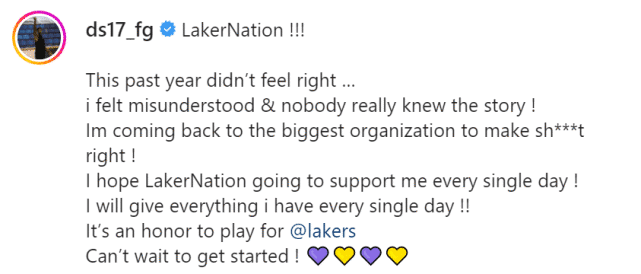 施罗德晒出多张自己效力湖人时的照片,包括他和詹姆斯进行交流,浓眉在场上拉起自己的画面,配文写道:“湖人国度!!!过去一年,感觉不太对……我觉得自己被误解了,没有人真正了解这个故事!我要回到最大的球会,让一切重回正轨!我希望湖人国度能每天都支持我!我每天都会拼尽全力!能为湖人效力是一种荣幸,迫不及待想要开始了!”