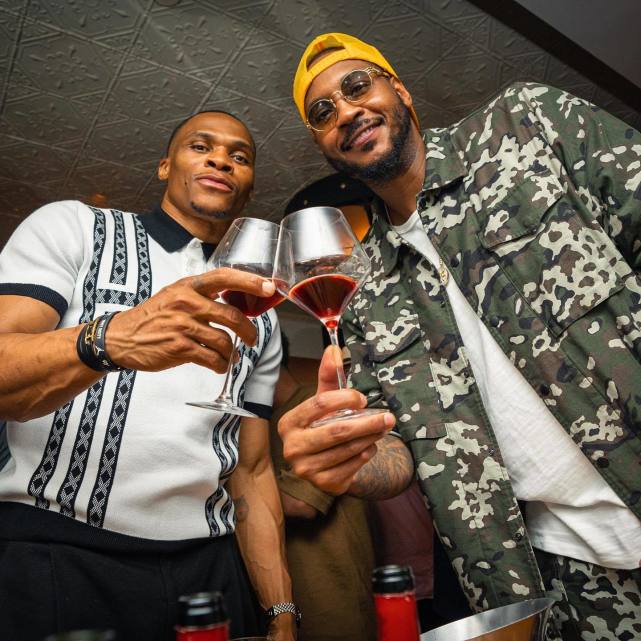 360直播09月14日,湖人球星威少亮相位于纽约的Vin Sur Vingt酒吧,为安东尼的红酒品牌VII(N) 捧场。安东尼晒出的动态中,威少和甜瓜碰杯合影,威少还拿着红酒冲着镜头说:“我为我的兄弟Melo而来,祝贺你,Melo,坚持你所做的事,这瓶我就带走了。干杯!”