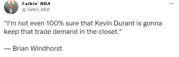 360直播09月13日,ESPN名记Brian Windhorst在节目中表示,相比于杜兰特新赛季夺得MVP,他更相信勇士能够夺冠,还表示若篮网打得不好,KD会重启交易申请。