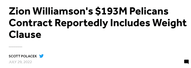 360直播07月29日讯 ,鹈鹕记者 Christian Clark报道称,锡安-威廉姆森的顶薪合同包含一个重要的条款,那就是对他的体重和体脂率有明确的限制。他需要定期称重,如果不达标,他的薪水保障部分就会下降,换言之,就是扣钱。