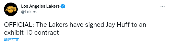 360直播07月28日讯 ,湖人官宣再签一人,湖人官方宣布,球队正式与中锋杰伊-胡夫签下了一份Exhibit-10合同,这是一份一年无保障训练营合同,湖人训练营大名单增至19人,仅剩最后一个名额。