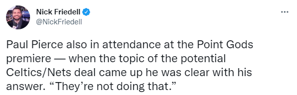 凯尔特人名宿保罗-皮尔斯也谈到关于杜兰特的交易流言,表示:他们(凯尔特人)不会这样做,这不会发生。换言之,皮尔斯认为凯尔特人不会交易布朗,他们不会拆散双探花的。