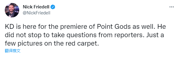 杜兰特身穿一件polo衫参加活动并且拍照合影,据美记者Nick Friedell发推报道,杜兰特参加首映礼,没有停下来回答记者的问题,只是走红毯并且拍了几张合影。