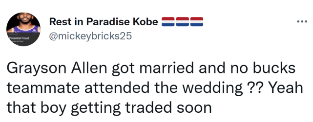 这一回,没有队友来捧场婚礼,也让阿伦成为球迷调侃的目标。一个球迷写道:“格雷森-阿伦大婚,却没有雄鹿队员来参加婚礼?这家伙很快就要被交易了吧。”