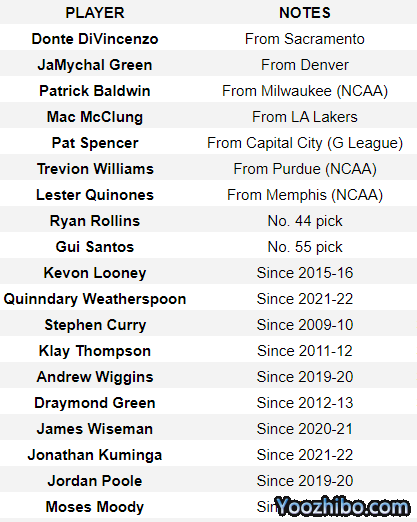 随着斯宾塞的签约,勇士的训练营名单增至17人。他们包括库里、汤普森、维金斯、格林、怀斯曼、库明加、普尔、穆迪、卢尼、迪文琴佐、贾麦考-格林、鲍德温、威瑟斯庞(双向)、基诺内斯(双向)、迈克朗(Exhibit 10)、特雷韦恩-威廉姆斯(Exhibit 10)、斯宾塞(Exhibit 10)。此外,新秀罗林斯和桑托斯尚未正式签约。