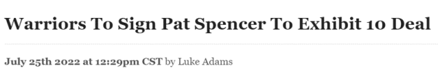 360直播07月26日讯 ,据名记Keith Smith报道,消息人士透露,勇士已与后卫帕特-斯宾塞签下一份无保障的训练营合同。据悉,斯宾塞签下的是一份Exhibit 10合同。