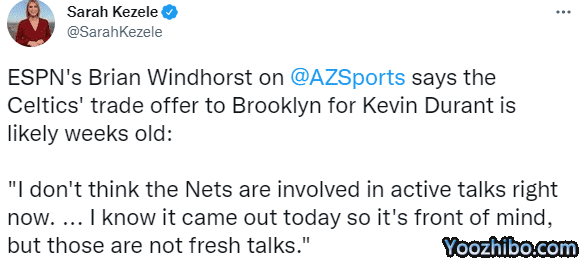 名记Brian Windhorst表示绿军早就和篮网进行了关于杜兰特的交易谈判,还表示:如果篮网不能得到满意的报价,他们会安然度过这场风暴。他们可以留住杜兰特到新赛季,或者这可能就是篮网对杜兰特申请交易事件谈判的立场。