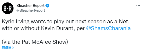 名记shams重申,无论杜兰特是否被交易,欧文都想要留在篮网;还表示若杜兰特被交易,篮网可能会送走欧文,篮网对欧文的要价是一个首轮签或者多个首轮签。