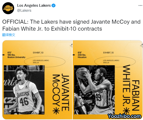 湖人官方宣布,球队与落选秀贾文特-麦考伊和小法比安-怀特签下Exhibit 10合同,这是一份一年无保障底薪训练营合同;目前湖人训练营大名单上已经有18名球员,其中包括16名正式球员。
