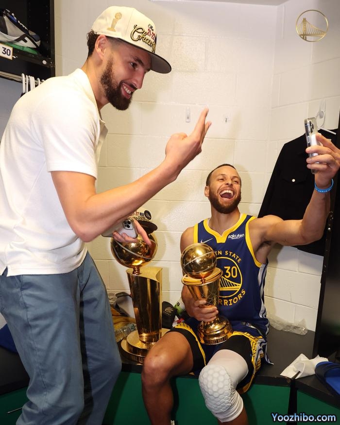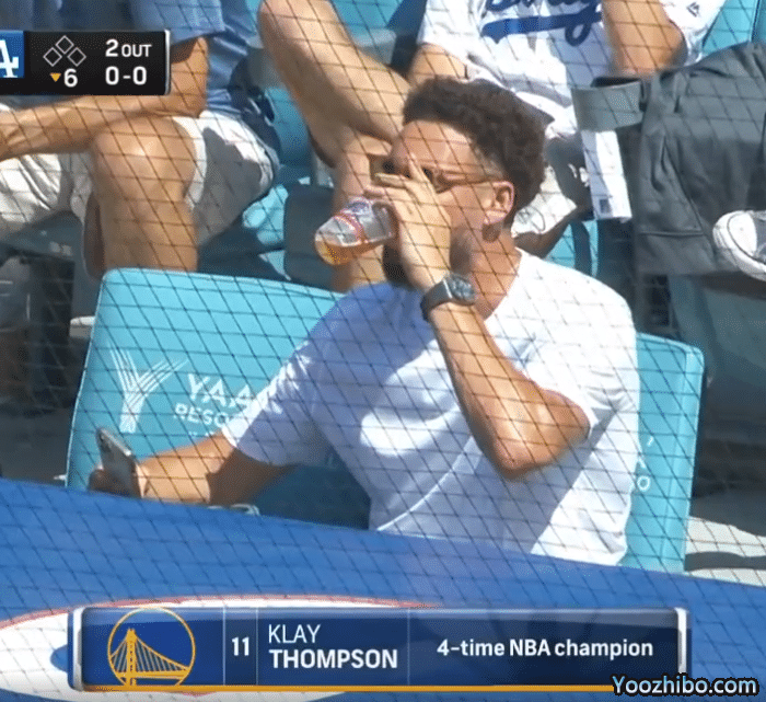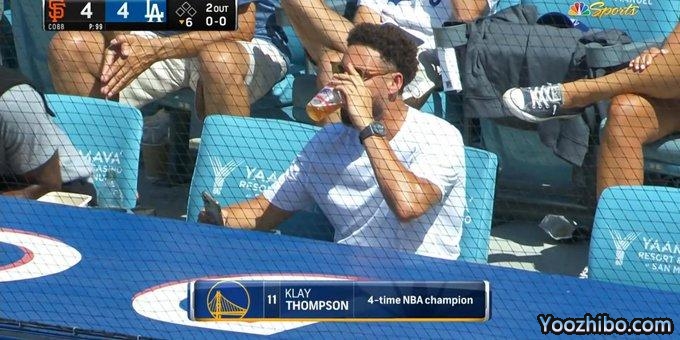 汤普森戴着墨镜、身穿白色T恤观看棒球赛,猛喝啤酒以及为道奇队疯狂跳舞庆祝,尽情享受休赛期;镜头给到克莱时,转播方备注写道:4次NBA总冠军。