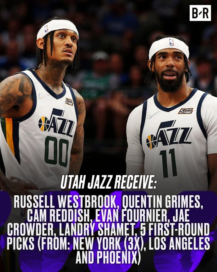 爵士送走米切尔等多名球员,得到威少、格兰姆斯、雷迪什、富尼耶、克劳德、沙梅特和5个首轮签(3个来自尼克斯,湖人和太阳各自付出一个)