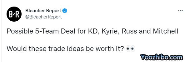 360直播07月24日讯 ,美媒《露天看台》发推写道:涉及杜兰特、欧文、威少和米切尔的五队交易方案,这样的交易方案合理吗?欧文加盟湖人,杜兰特前往太阳,威少加盟爵士和米切尔加盟尼克斯,篮网获得多名年轻球员和5个首轮选秀权。