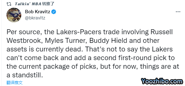 名记Bob Kravitz报道,湖人想要威少加一个首轮换取步行者的希尔德和迈尔斯-特纳的交易谈判已经失败,交易流产的一大原因是步行者想要在交易中多要一个首轮签,湖人不愿意给;湖人老板珍妮-巴斯拒绝再加一个首轮签,除非球队真的具备夺冠实力。