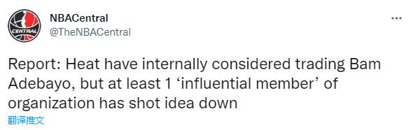 据热火随队记者Ira Winderman报道,有知情人士称,热火曾想用阿德巴约当成引援杜兰特的交易筹码,但队内至少有一名“有影响力的队员”最终否定了这一想法。