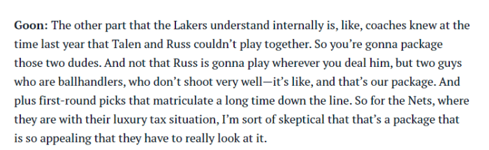 湖人一直在推动交易,但他们能用的谈判筹码有限,湖人队记Kyle Goon在节目中表示:湖人教练组内部,去年就明白威少和霍顿-塔克不能一起打球,所以他们寻求打包送走他俩,这两人都是控球手,并且投篮能力不好,这就是湖人打包他俩的原因。并且加入首轮签已经是华润谈判桌上的固定筹码了。