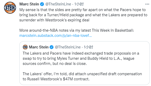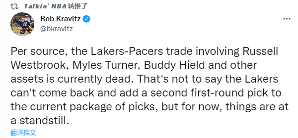 名记Marc Stein也报道湖人与步行者的2换2交易未接近达成,双方意见相左。