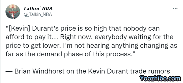 名记Brian Windhorst在节目上透露杜兰特交易失败的最大原因,他表示:篮网对杜兰特的要价太高,没有球队能给得起,所有向篮网寻求交易的电话谈判都失败了;接下来有两种情况会发生,要么篮网降价交易杜兰特,要么杜兰特脱离交易市场。