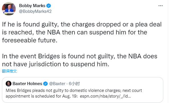 NBA薪资专家Bobby Marks表示,如布里奇斯被判有罪或他签下认罪协议,联盟在可预见的未来将有权对其禁赛;若布里奇斯被判无罪,联盟将不具备做出禁赛处罚的权力。