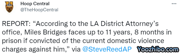 今夏布里奇斯本该与黄蜂签下亿元大合同,结果他因家暴伤人重罪和虐待儿童的罪名吃上官司;黄蜂此前已经撤销对他的资质报价,其他球队更不会给他开出合同,若罪名成立,布里奇斯不仅面临生涯提前结束的境地,而且面临多年牢狱之灾。