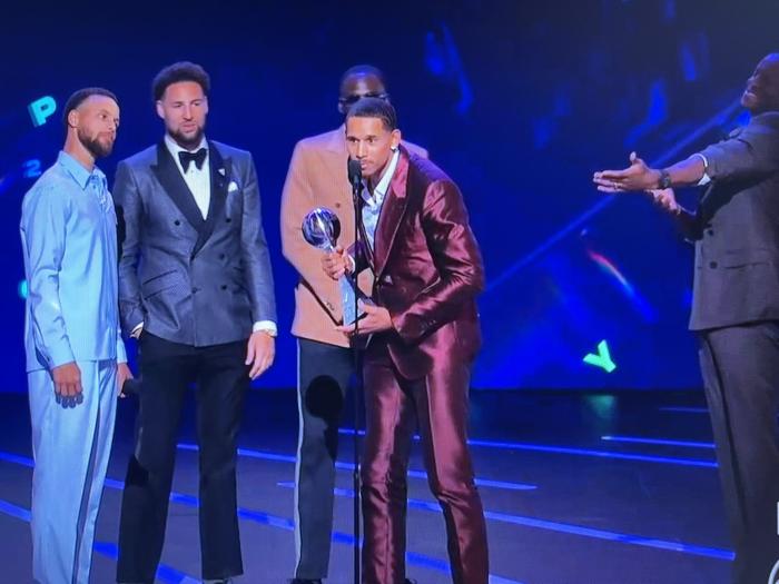库里、汤普森、追梦格林、伊戈达拉和安德森(湖人新援)同时上台领奖,伊戈达拉在舞台上发言:我们刚刚让拉科布被联盟罚款50万美元,对不起,乔;站在一旁的库里咧嘴大笑。