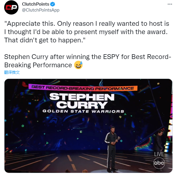 第二、库里获得ESPY年度最佳破纪录表现奖