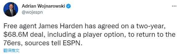 360直播07月21日讯 ,据ESPN名记沃纳罗斯报道,哈登已经同意与76人续约,双方签下2年6860万美元的新合同,合同中包含球员选项,留守76人,继续联手恩比德冲击总冠军。
