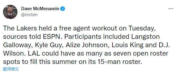 360直播06月08日讯 ,除了试训郭昊文等年轻人之外,湖人也开始试训自由球员;据NBA记者Dave McMenamin报道,今天湖人试训了五名自由球员,篮网两大旧将在列;还表示湖人今夏可能会有7个空缺位置,换句话说,可能会有7人离队。