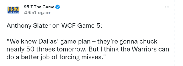 独行侠能够赢下G4一战的关键,还在于他们的三分球。独行侠在G4的三分表现是43投20中,而勇士是28投10中,就在这一点上,独行侠比勇士多投中10个三分球。Slater表示:“我们知道达拉斯的比赛计划——他们要出手接近50次三分球,但我认为勇士可以在防守三分方面做得更好,让他们投丢更多。”